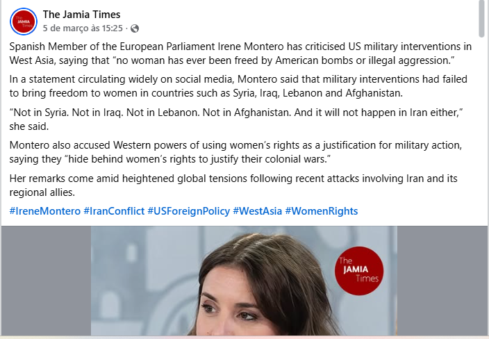 A deputada espanhola na União Europeia Irene Montero criticou diretamente essa retórica ao afirmar: “Nenhuma mulher jamais foi libertada por bombas dos EUA.” A declaração resume a crítica de que a opressão vivida por mulheres em regimes autoritários não se resolve por meio da destruição militar.