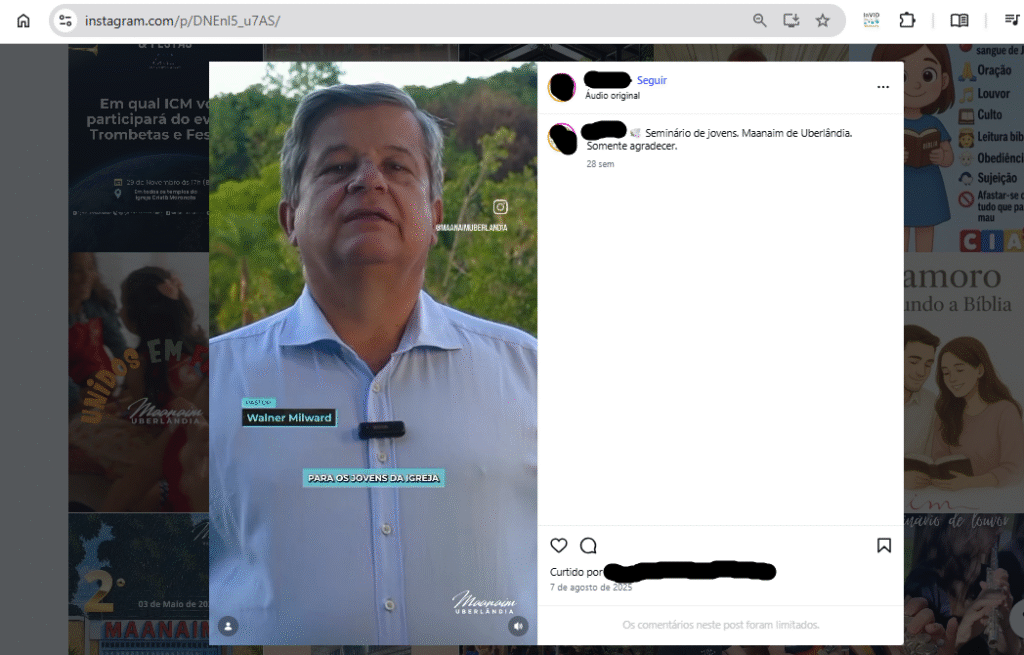 No vídeo, o pastor Walner Milward grava mensagem com um versículo bíblico dirigido ao Seminário de Jovens Maanaim de Uberlândia. A publicação foi removida pouco depois de o Bereia registrar a captura da tela. A conta responsável pela republicação do vídeo também tornou-se privada nas horas seguintes ao registro da impressão da tela.