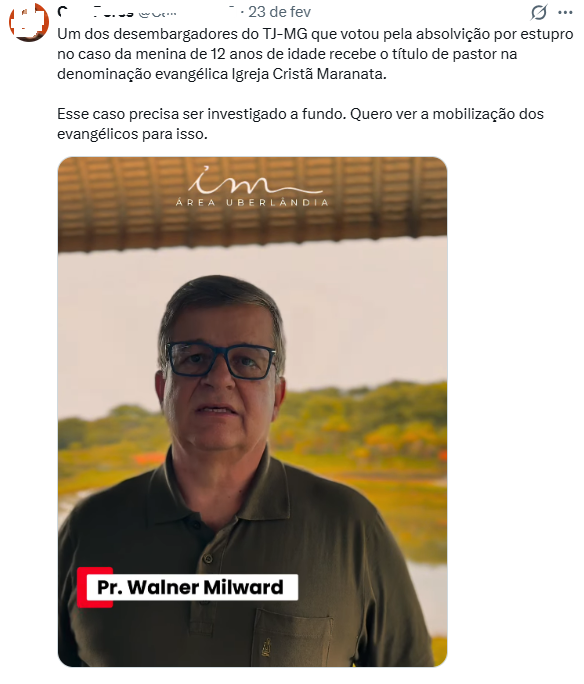 Diante da verificação realizada, o Bereia confirma que o desembargador Walner Barbosa Milward de Azevedo, que formou a maioria que absolveu, no Tribunal de Justiça de Minas Gerais (TJMG), réu acusado de estupro de vulnerável, é pastor evangélico. Bereia localizou vídeo originalmente publicado por perfil vinculado à Igreja Cristã Maranata, no qual Milward profere mensagem com versículo bíblico e é identificado como pastor. O conteúdo foi posteriormente removido, e a conta que o republicou tornou-se privada após o registro feito pela reportagem. Além disso, foram identificadas interações públicas do desembargador com perfis ligados à denominação e um registro em reportagem que cita a esposa de Milwaard e confirma a titulação dele como pastor e desembargador.