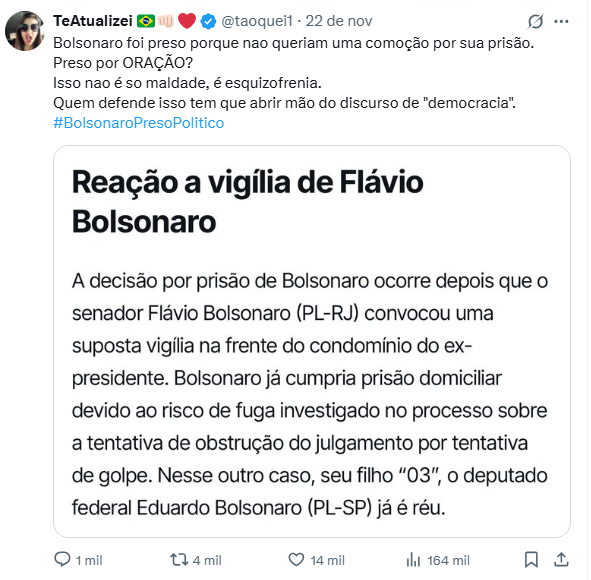 Muito conteúdo desinformativo passou a circular com a aproximação do final do processo em que o ex-presidente Jair Bolsonaro foi condenado por vários crimes referentes à tentativa de golpe de Estado em 2022 e 2023. Depois do sábado, 22 de novembro, quando foi emitida a ordem de prisão preventiva de Bolsonaro em regime fechado, as publicações com falsidades e mentiras foram intensificadas.