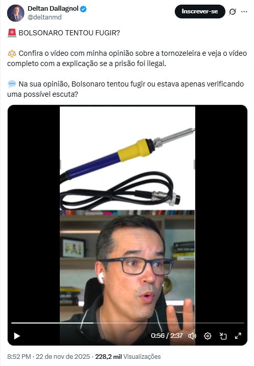 O ex-procurador da República, deputado cassado por irregularidades na campanha eleitoral, Deltan Dallagnol (Novo-PR) também publicou um vídeo, em que, com voz exaltada, credencia a versão da escuta na tornozeleira.