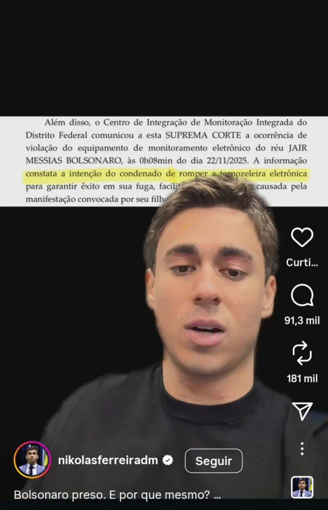 Mais tarde, foi tornada pública a ordem de prisão emitida pelo STF, por meio do ministro responsável pelo caso, Alexandre de Moraes, que foi cumprida na manhã do sábado, 22 de novembro. Nela constava como causa o “risco concreto e iminente de fuga” por conta de duas situações vinculadas: a violação da tornozeleira eletrônica, que foi confessada pelo réu, e a convocação de uma vigília religiosa. No entendimento do ministro, a “eventual realização da suposta ‘vigília’ configura altíssimo risco para a efetividade da prisão domiciliar decretada e põe em risco a ordem pública e a efetividade da lei penal”.