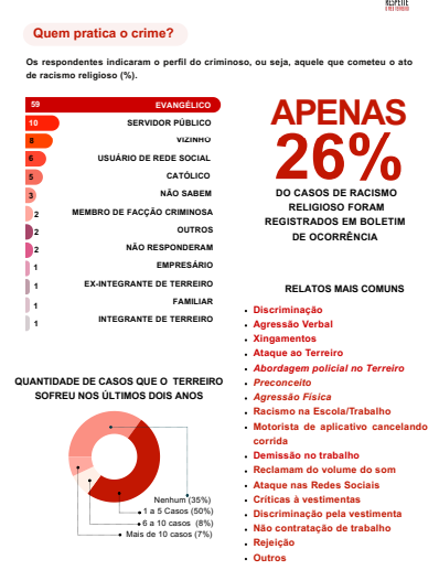 O relatório apresenta análises sobre impactos físicos e emocionais da violência, casos de racismo religioso em ambientes offline e online, perfis dos agressores, locais onde as agressões ocorrem com maior frequência, além de indicadores regionais. O material também reúne propostas de enfrentamento elaboradas pelas próprias lideranças e orientações de denúncia para responsabilização dos autores.