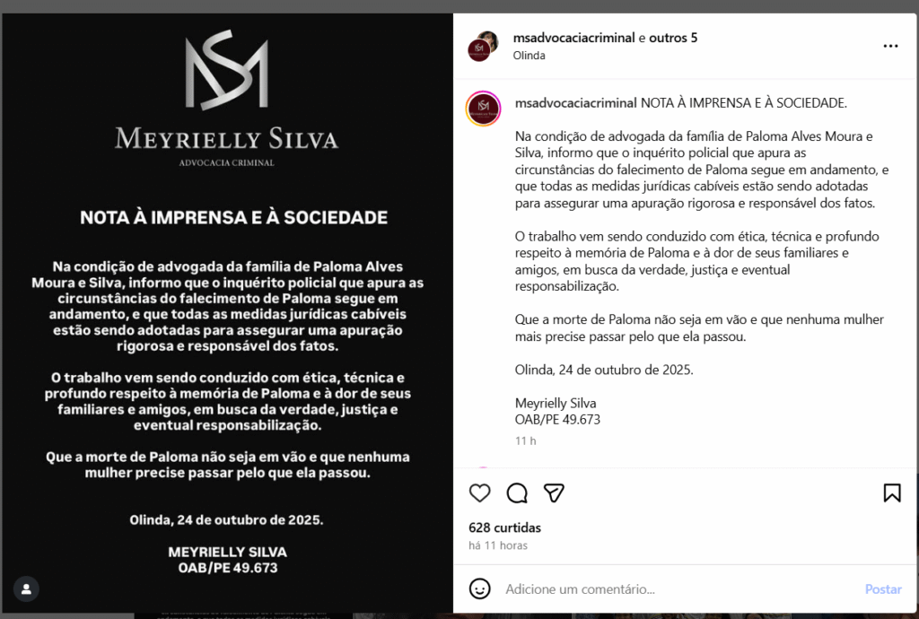 A advogada da familia Meyrielly Silva publicou em sua conta no Instagram uma nota à imprensa onde afirma que o inquérito de investigação segue em andamento e que todas as medidas jurídicas cabíveis estão sendo adotadas.