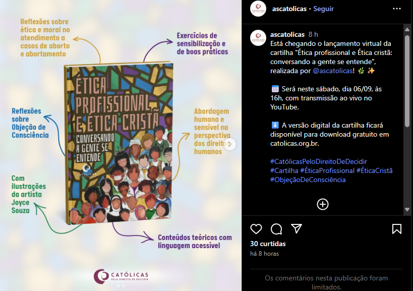 Na contramão dessa lógica, a cartilha Ética Profissional e Ética Cristã: conversando a gente se entende, lançada por Católicas pelo Direito de Decidir, aposta no diálogo, entre ética profissional e fé, e oferece instrumentos concretos para que profissionais de saúde atuem de forma ética, responsável e respeitem os direitos das vítimas.