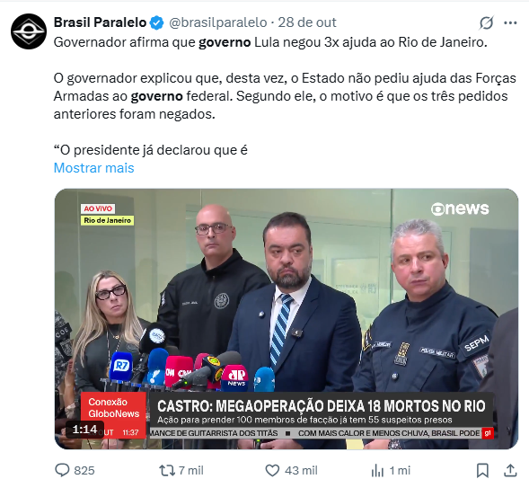 Em declarações públicas, o governador do Rio, cantor gospel católico, Cláudio Castro, durante a ação policial de 28 de outubro, afirmou que o governo federal teria negado três pedidos de apoio das Forças Armadas (por exemplo, blindados) ao estado do Rio de Janeiro. O governador chegou a dizer: “o estado está “sozinho” e “não temos ajuda das forças de segurança [federais] nem [do] Ministério da Defesa. Mídias de notícias publicaram esse conteúdo sem checagem e ele foi amplamente disseminado.