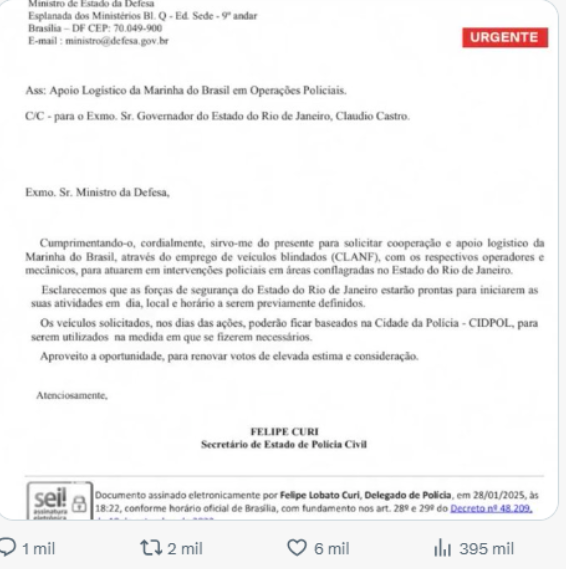 O pedido de janeiro foi, de fato, encaminhado ao Ministério da Defesa, referente a demanda específico de blindados à Marinha do Brasil, para patrulhamento da região onde está localizado o Hospital Naval Marcílio Dias, mesma Zona Norte do Rio, onde uma médica capitã de Mar e Guerra foi ferida por uma “bala perdida”, em dezembro de 2024. A Advocacia Geral da União (AGU) emitiu parecer técnico, em fevereiro de 2025, com a indicação de que o pedido de blindados não poderia ser atendido pelas Forças Armadas diretamente e que só teria condições de ocorrer no contexto de uma operação de Garantia da Lei e da Ordem (GLO). Segundo a AGU, tal demanda exigiria outro tipo de encaminhamento que culminaria com um decreto presidencial. Não foi dada sequência ao caso.