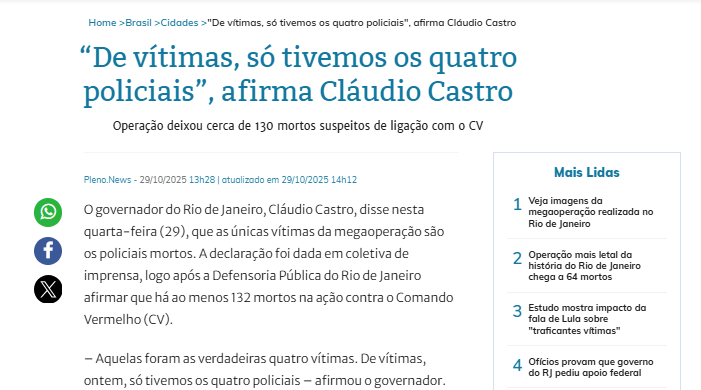 Outra declaração desinformativa do governador Claudio Castro diz respeito aos mortos. Em entrevista no dia seguinte à ação policial, ele afirmou que dos mais de 100 mortos, apenas quatro são vítimas – os policiais. O governador também disse que se a polícia matou algum inocente, foi algo ‘residual’. O portal religioso de notícias Pleno News deu destaque à fala em matéria.