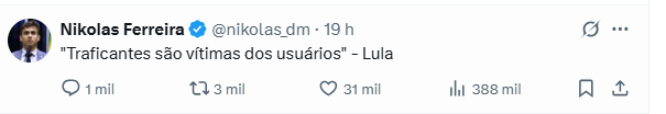 De imediato houve uso político da declaração por parte de lideranças do PL e apoiadores nas redes, com a afirmação de que Lula estaria defendendo traficantes como vítimas. Nikolas Ferreira já havia publicado naqueles dias. “Lula acaba de anunciar que traficantes são vítimas dos usuários. No ritmo que vai, daqui a pouco o PCC vira ONG”, escreveu no X.