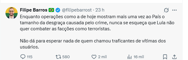 Os evangélicos Filipe Barros (PL-PR) e Nikolas Ferreira (PL-MG) usaram a distorção de uma fala confusa do presidente da República, proferida na semana anterior, para propagarem que o governo federal defende o tráfico e não classifica as facções como terroristas.