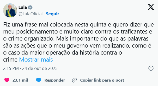Desde a semana anterior e novamente após a megaoperação policial no Rio, há o uso enganoso da fala, de fato, confusa do presidente como munição de oposição, com a distorcida alegação de que o governo federal defende o tráfico e os traficantes. Uma audição atenta da entrevista em Jacarta e uma leitura simples da transcrição do que Lula disse são suficientes para identificar o discurso de que o tráfico não se sustenta sozinho e que é importante levar em conta o consumo de drogas pelas classes média e alta das populações, o que é base para a manutenção deste mercado ilegal que gera vítimas de todo tipo.