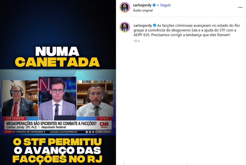 Já o deputado federal católico Carlos Jordy usou o caos no Rio para criticar o STF que julgou favoravelmente a Arguição de Descumprimento de Preceito Fundamental (ADPF) 63 sobre o que Jordy atribui o “avanço das facções criminosas”. A declaração do deputado é falsa, pois, além de não estar respaldada no objetivo da ação julgada no STF, ele faz a crítica sem qualquer embasamento científico ou, ao menos, em dados.