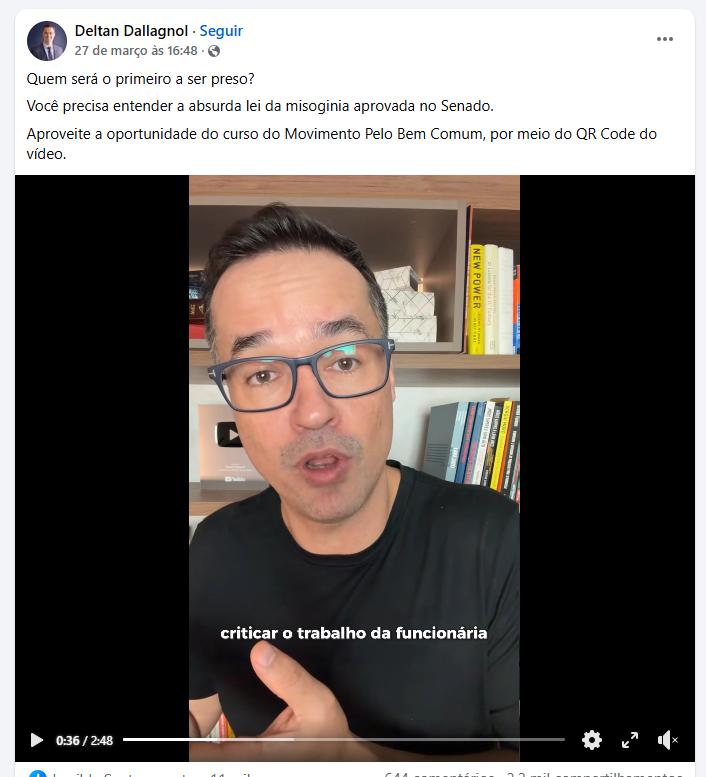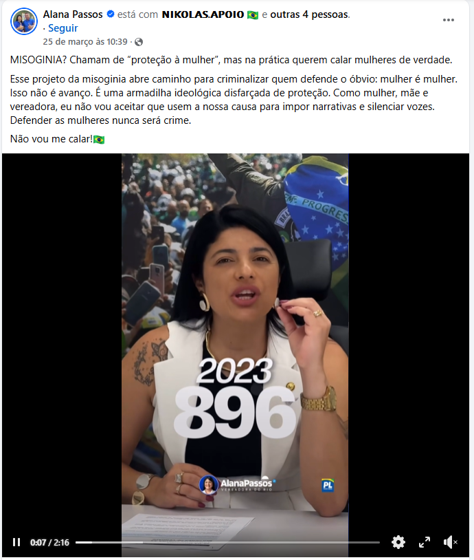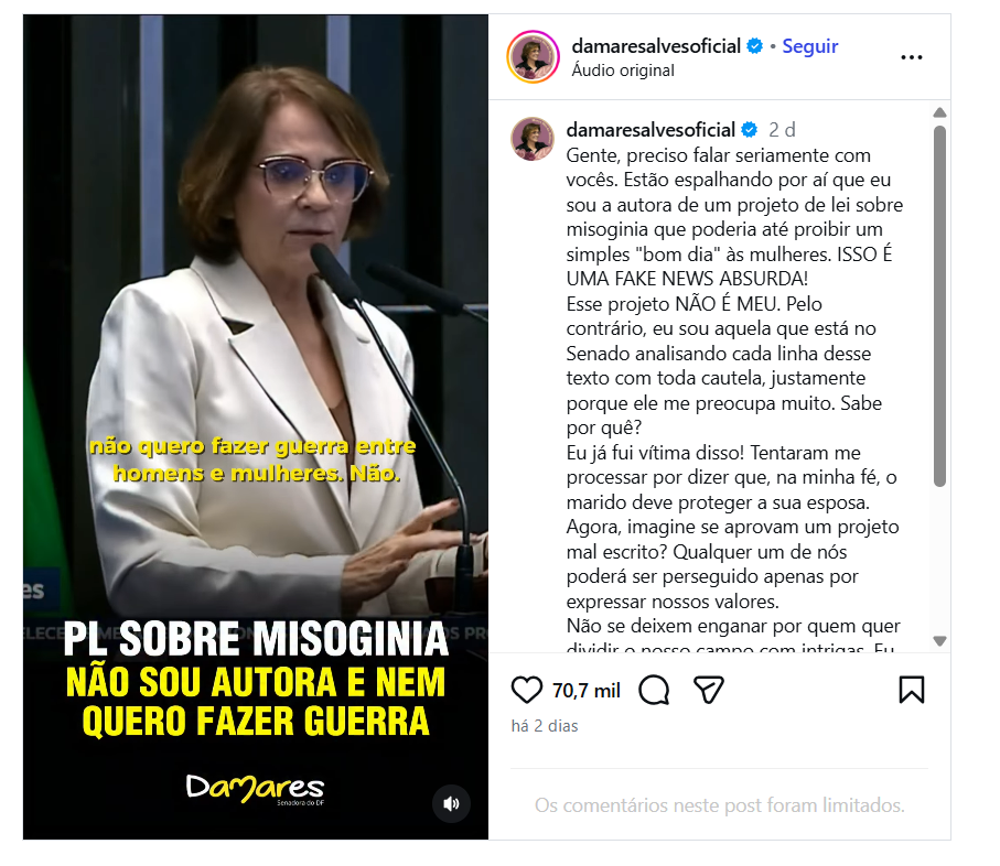 “Gente, preciso falar seriamente com vocês. Estão espalhando por aí que eu sou a autora de um projeto de lei sobre misoginia que poderia até proibir um simples “bom dia” às mulheres. ISSO É UMA FAKE NEWS ABSURDA! Esse projeto NÃO É MEU. Pelo contrário, eu sou aquela que está no Senado analisando cada linha desse texto com toda cautela, justamente porque ele me preocupa muito. Sabe por quê? Eu já fui vítima disso! Tentaram me processar por dizer que, na minha fé, o marido deve proteger a sua esposa. Agora, imagine se aprovam um projeto mal escrito? Qualquer um de nós poderá ser perseguido apenas por expressar nossos valores. Não se deixem enganar por quem quer dividir o nosso campo com intrigas. Eu não quero guerra entre homens e mulheres; eu quero famílias fortes e protegidas!”