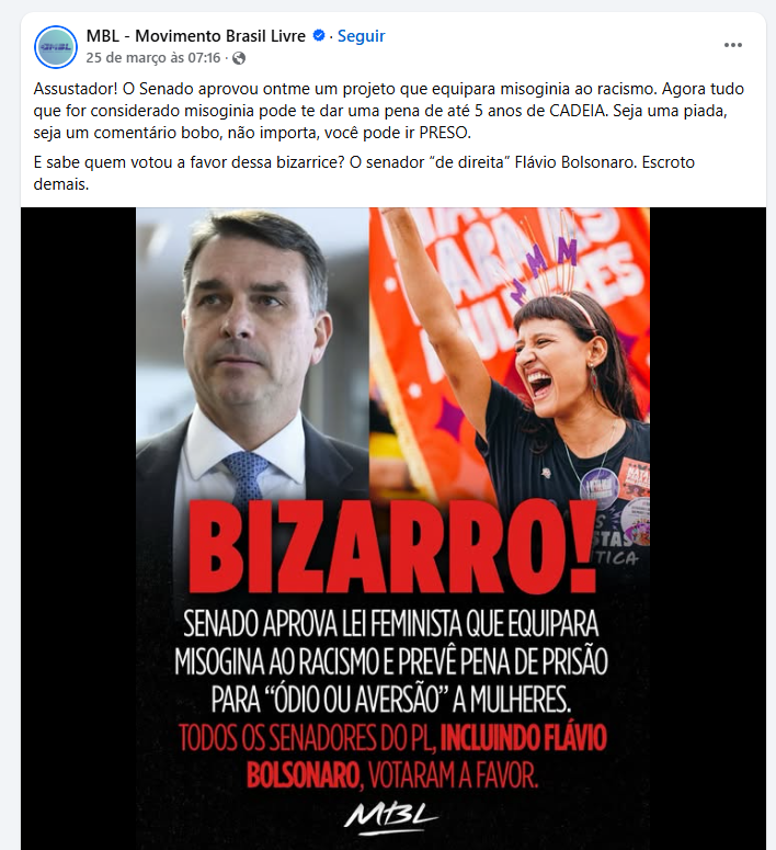 Circula nos últimos dias de março uma série de publicações e comentários marcados por distorções e mentiras sobre a chamada Lei da Misoginia, aprovada no Senado no último 24 de março. A inclusão da misoginia entre os crimes de preconceito ou discriminação (Projeto de Lei 896/2023) foi aprovada por unanimidade pelo Plenário da casa. O texto define a misoginia como “a conduta que exteriorize [expresse/comunique] ódio ou aversão às mulheres”. As penas estabelecidas para esse tipo de crime variam entre um a cinco anos de prisão, além de multa. A Lei também inclui a expressão “condição de mulher” entre os critérios de intolerância e discriminação, a partir da interpretação da Lei do Racismo (Lei 7.716, de 1989), ao lado de cor, etnia, religião e procedência.