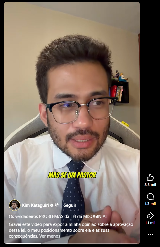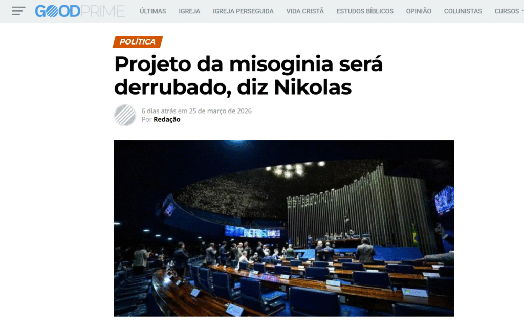 Um dos vídeos publicados pelo deputado federal evangélico Nikolas Ferreira (PL-MG) sobre a aprovação da Lei da Misoginia no Senado oferece conteúdo que classifica o projeto como uma “aberração”. Nos 13 minutos gravados, o parlamentar mineiro afirma que trabalhará na Câmara para derrubar a aprovação do Senado. “É um instrumento de lei extremamente subjetivo para silenciar outras pessoas”, disse, oferecendo como exemplo que não se pode mais criticar mulheres, perguntando se “estão na TPM”.