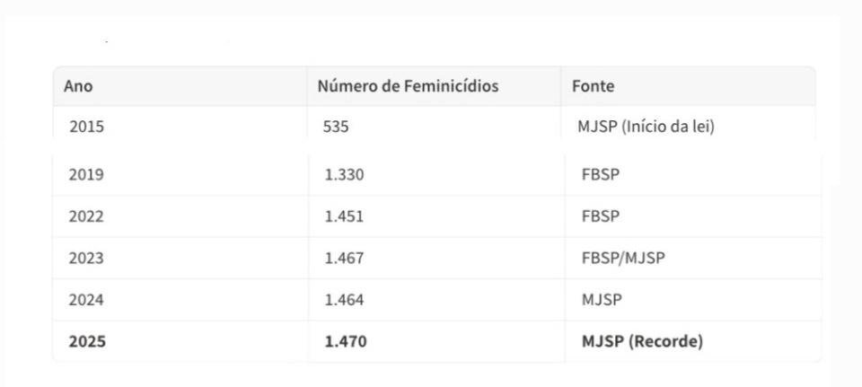 G1 rhttps://g1.globo.com/google/amp/politica/noticia/2026/01/20/brasil-registra-recorde-historicos-de-feminicidios-em-2025-quatro-mulheres-sao-assassinadas-por-dia-no-pais.ghtml Acesso em 3 mar 2026