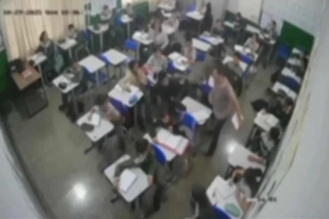 Nas imagens gravadas por uma câmera de segurança, o professor tropeça em uma mochila no chão, recoloca o objeto no lugar e, ao se levantar, passa a golpear a mesa de outro estudante repetidas vezes.