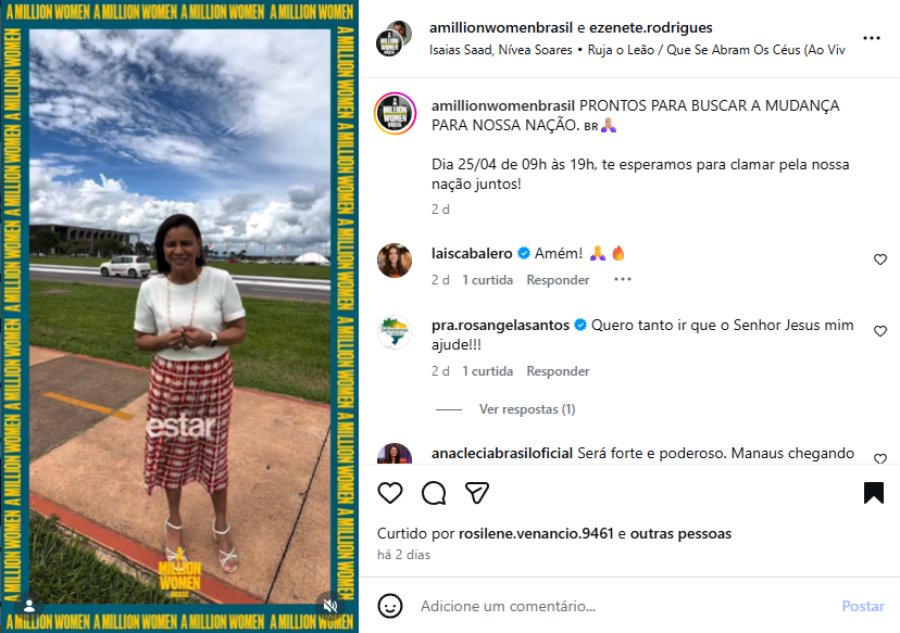 De fato, o evento é uma versão brasileira do movimento A Million Women, criado pelo líder evangélico estadunidense Lou Engle, conhecido por fundar o movimento de oração e jejum The Call [O Chamado], voltado a “oração e jejum por questões morais e espirituais em diversas nações” . Ativo desde os anos 70, ele é uma figura central em grandes mobilizações religiosas com tom político, como o movimento de jovens The Send [O Envio], que chegou ao Brasil em 2020. Engle tem forte conexão com evangélicos brasileiros, com participação frequente em conferências em igrejas como a Lagoinha. Em 2024, Eagle criou o movimento para mulheres A Million Women [Um milhão de mulheres] para “orar pelos Estados Unidos”, em expressiva campanha pela reeleição de Donald Trump (Partido Republicano), bem como por apoio às ações bélicas do Estado de Israel.