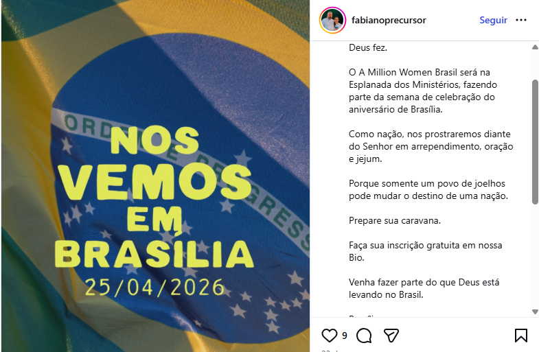 Em outra postagem, a organização utiliza referências bíblicas para reforçar o caráter mobilizador do encontro e convoca os participantes para uma atuação direta na vida pública e espiritual do país:
