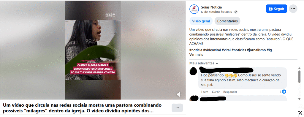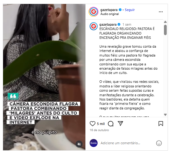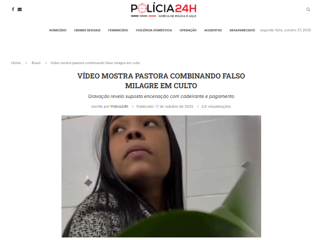 Circula nas redes um vídeo apresentado como flagrante de uma pastora em ação na qual ela combina “milagres” com atores antes de um culto. A publicação viralizou, alcançando mais de um milhão de visualizações, centenas de compartilhamentos e “reacts”, além de ser replicada por perfis e portais de notícias que a utilizam para atacar a fé evangélica.